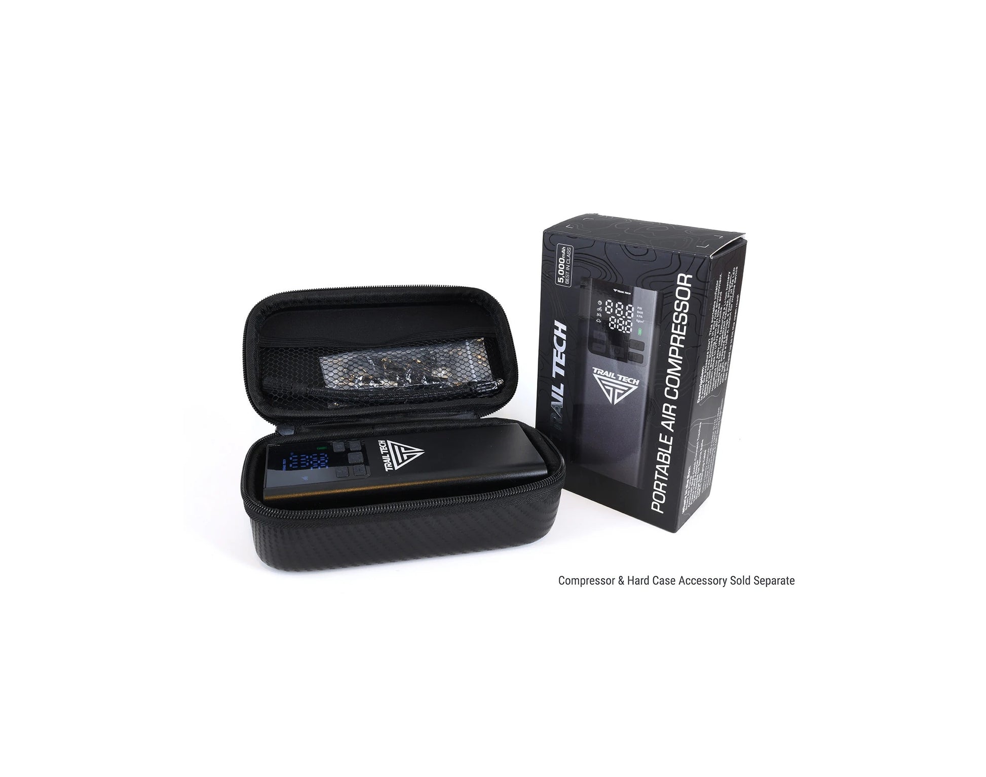 HARD CASE ACCESSORY: The Portable Air Compressor comes with a flexible black storage bag. An accessory faux carbon fiber hard storage case is available for purchase separately.